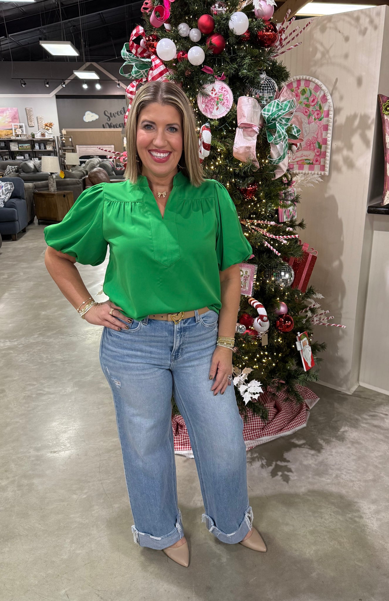 True to size top! Model is wearing a medium and is a 8/10! V detail on top! Bigger busted size up!