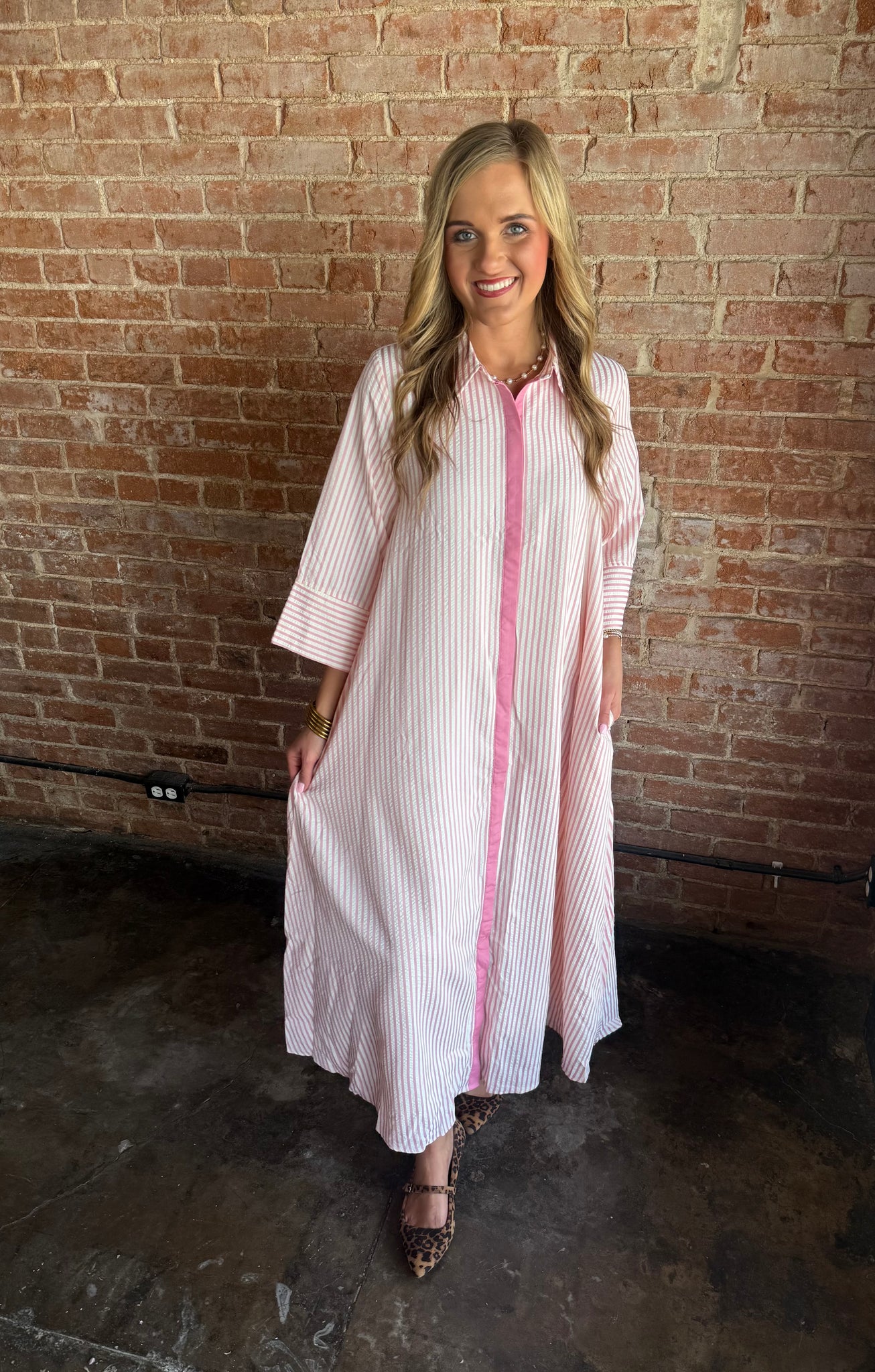 Model is in a small and is a 6/8 B in the dress! Dress has lots of room and pockets!